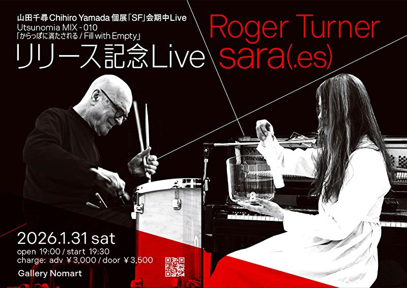 2025年1月31日、ギャラリーノマルの高嶋英男展「からっぽに満たされる」空間で初共演を果たしたsara (.es)と英国の重鎮ドラマー、ロジャー・ターナー。初対面、初共演での共鳴のセッション音源が2025年12月24日にリリース! 奇しくも初共演からちょうど一年となる2026年1月31日、再びノマルでの共演が決定。アルバム「からっぽに満たされる / Fill with Empty」リリース記念ライブとして本ライブを開催いたします。 今回は山田千尋展での共演。音楽のみならずアートとの関わりが深い両者による、新たな音空間の出現は必至。いざ、祝福の空間へ!